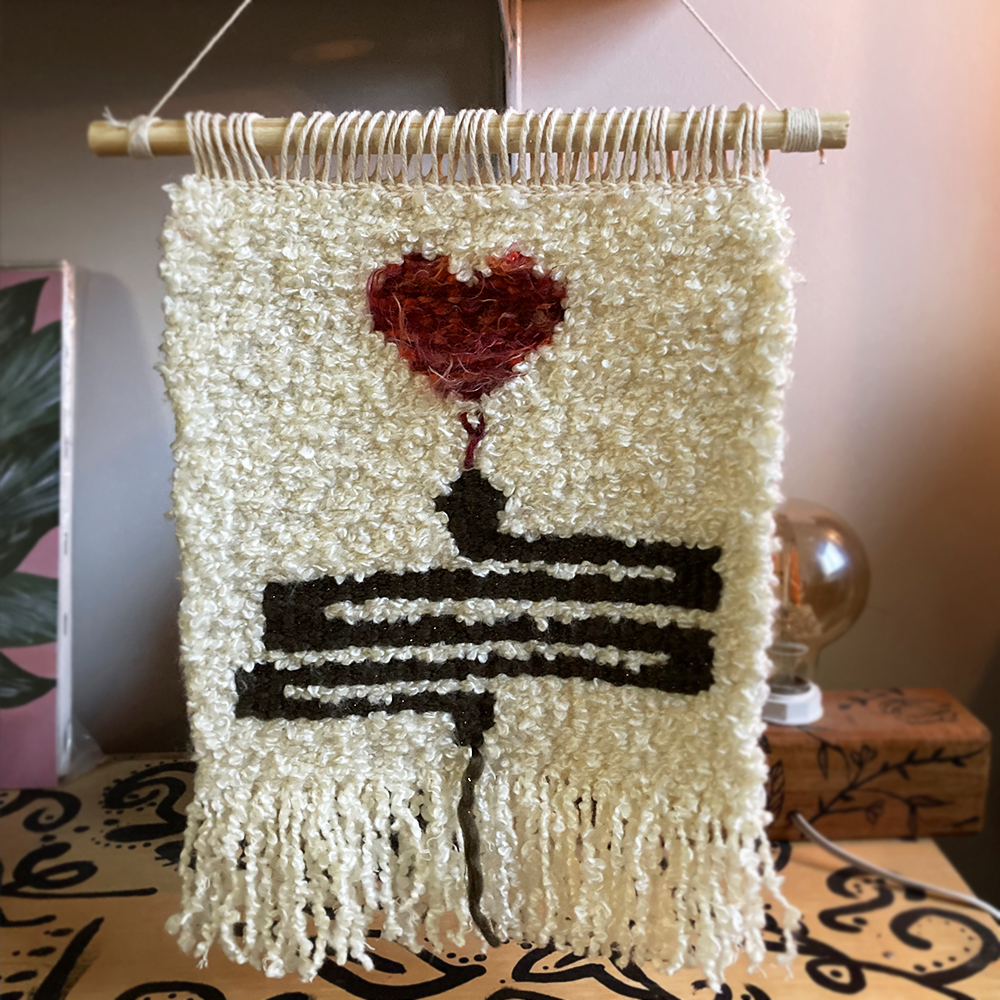 Painel de Tear Cobra Off-White com Coração Vermelho Arte Têxtil em Lã e Barbante